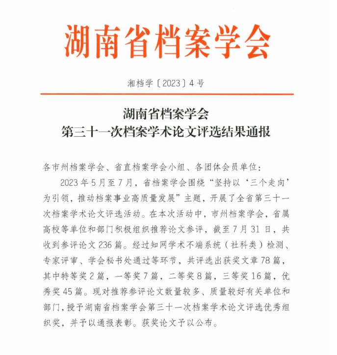 2023年5月至7月,湖南省檔案學會圍繞“堅持以“三個走向’為引領(lǐng),推動檔案事業(yè)高質(zhì)量發(fā)展”主題,開展了全省第三十一次檔案學術(shù)論文評選活動。在本次活動中,湖南德爾斐科技總經(jīng)理付盟撰寫的《信息化背景下檔案開放路徑研究》論文,榮獲優(yōu)秀獎。